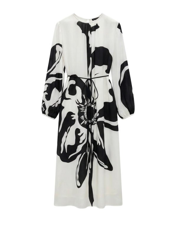 فستان ميدي واسع أسود وأبيض بحزام من القماش - MADP727