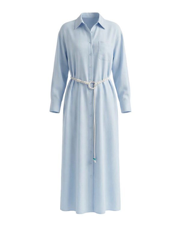 التصميم: طويل، أكمام طويلة، ياقة بفصوص فضية، حزام من نفس الخامة